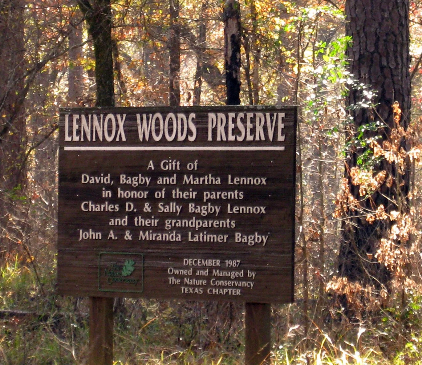 During their lifetimes, Martha, David and Bagby Lennox recognized the need to preserve natural resources in Red River County. They donated timberlands identified as the Lennox Woods, located north of Clarksville, Texas, to the Nature Conservancy of Texas. The Lennox Foundation has continued the support given by the Lennox siblings for land and nature preservation. Past contributions from the Lennox Foundation to the Nature Conservancy has allowed additional lands to be acquired to protect the watershed around the Lennox Woods.